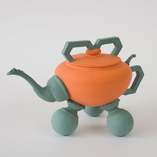 H18.5cm x D27cm. Combination of glass lid, metal lamp base, saltshaker, metal bed knobs, pewter teapot handle and spout. Slip casting. Stained porcelain.